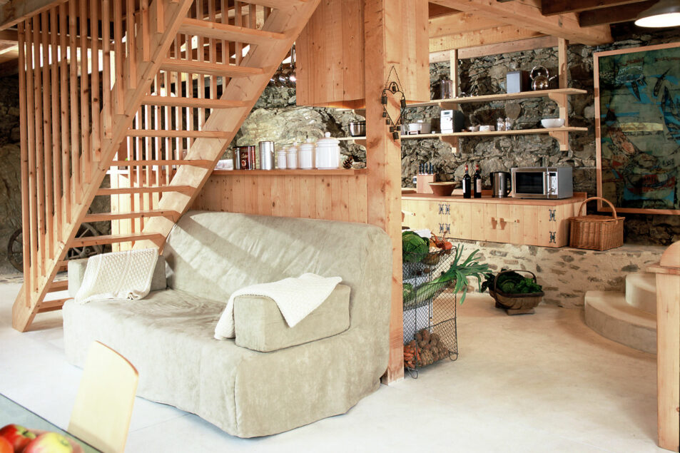 Restauration d'un ancien atelier de menuiserie en gite, implanté en bord de chaussée et construit sur le rocher. Aménagement intérieur de type loft. A peine visible, la percée de toiture permet d'offrir aux chambres la lumière du levant et une petite terrasse donnant sur la falaise. La cuisine est équipé de portes en planches brutes garnies de charnières à l'ancienne et de loquets en bois. Le sol est en ciment de couleur sable et le bois apparent brut naturel afin de réchauffer la pierre sombre des murs.