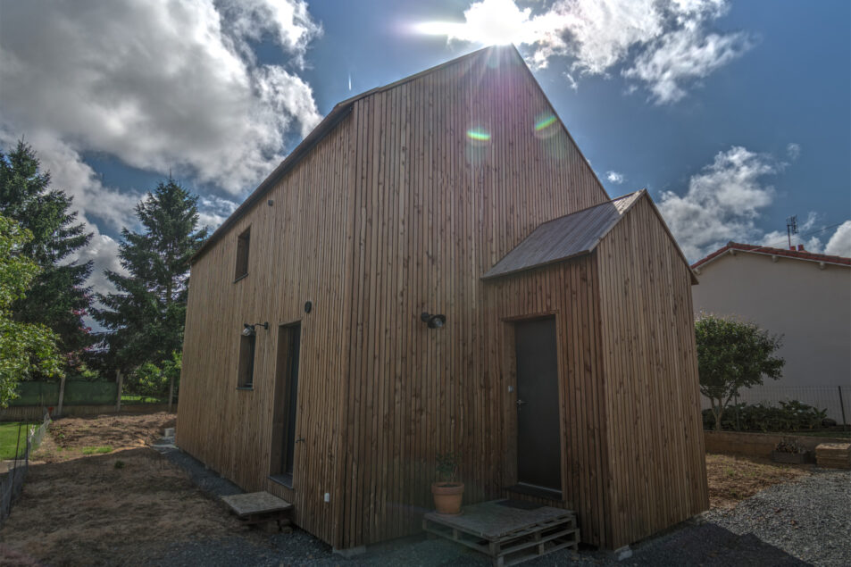 Création d'une maison à ossature bois, posée sur plots béton ; l'ensemble des façades et de la couverture ont été réalisé en bardage bois ; l'isolation en laine de bois et en chanvre-lin a été sur-dimensionnée dans le but de se rapprocher du label Maison Passive. L'orientation et les surfaces des baies vitrées permettent un apport de chaleur l'hiver, qui réduit la consommation de bois pour le seul chauffage de la maison : un petit poële à bois de 4.5kW !