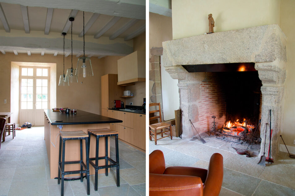 Réaménagement de l'ensemble du rez-de-chaussée d'un logis du XVIIème siècle. Mise à nu des pièces existantes, résolution de problèmes d'humidité, réfection des sols, changement des ouvertures extérieures, création d'une cheminée et d'une bibliothèque sur-mesure et décoration intérieure. Création de salles d'eau à l'étage.