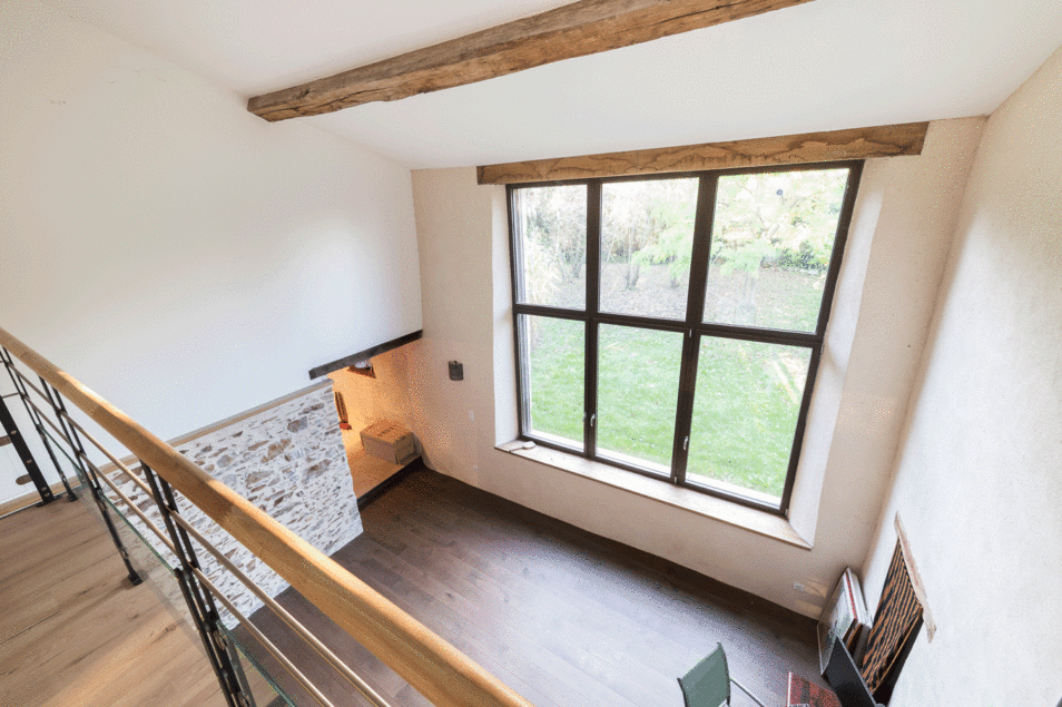 Transformation d'une partie de grange en pièce habitable. Création d'une ouverture extérieure avec une menuiserie de type verrière pour apporter de la luminosité à la pièce et une vue directe sur le jardin. Un enduit chaux-chanvre a été appliqué sur l'ensemble des murs intérieurs.