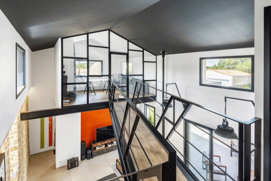 L'ancienne grange a été repensée pour y voir apparaitre une maison d'habitation de style contemporaine. Une extension et surélévation viennent apporter du volume à l'ensemble. Des ouvertures extérieures ont été modifié afin d'harmoniser les façades. Le vocabulaire industriel prend le dessus à l'intérieur de l'habitation.